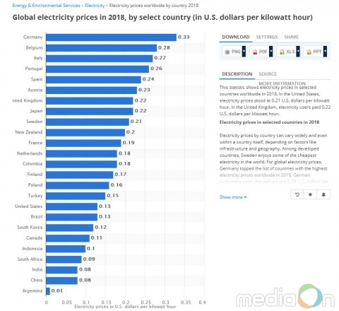 전기세는 인프라나 지리적 요소 등으로 인해 국가마다 다르다. 심지어 한 국가 내에서도 큰 차이를 보인다. 미국 리서치 기관 스테티스타의 지난 2018년 전세계 일부 국가 전기세 통계에 따르면 아르헨티나의 전기세가 Kwh 당 0.01달러로 가장 저렴하다. 중국과 인도가 0.08달러로 그 뒤를 따르며, 남아프리카는 0.09달러로 세 번째로 전기세가 저렴하다. 반면 전기세가 가장 높은 국가는 독일로 0.33달러에 부가가치세도 추가로 징수된다.
