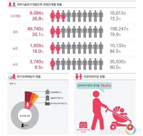 과학기술인력 중 여성비율은 20.1%로, 20% 수준에 진입하였으며 정규직 재직여성도 전년 대비 증가