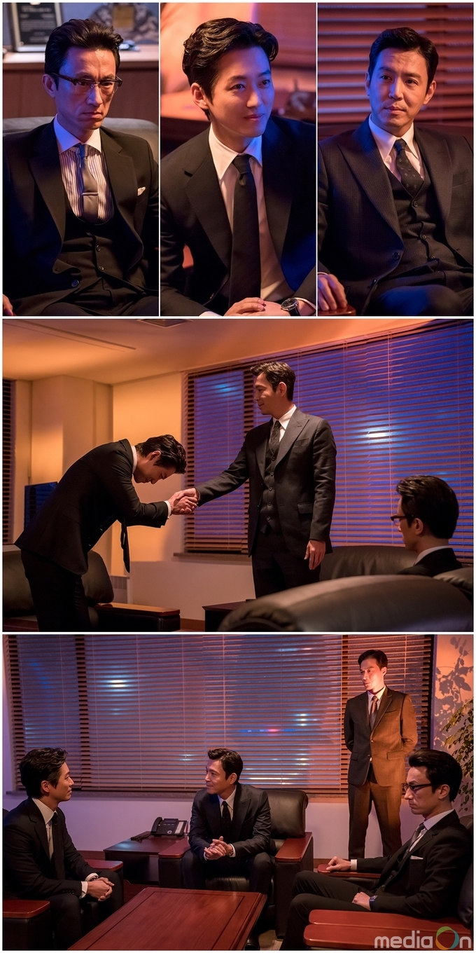 이와 관련 공개된 사진 속에는 블랙 수트 차림으로 흡사 큰 계약이 걸린 비즈니스 현장을 방불케하는 분위기 속 심상치 않은 세 사람의 첫 만남이 담겨있어 시선을 사로잡는다. 남궁민과 김병철은 서로의 반대편에 최원영은 상석에 앉아있어 이들 사이의 권력 상하 관계를 한 눈에 보여준다.