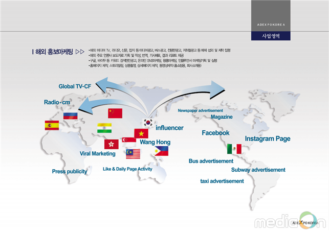 주)애드엑스포코리아는 2009년 마케팅법인으로 설립되어 현재 중소기업부 수출바우처사업의 수행기관으로 중국, 베트남, 인도등 해외수출마케팅 및 판로지원서비스를 제공하고 있다.
