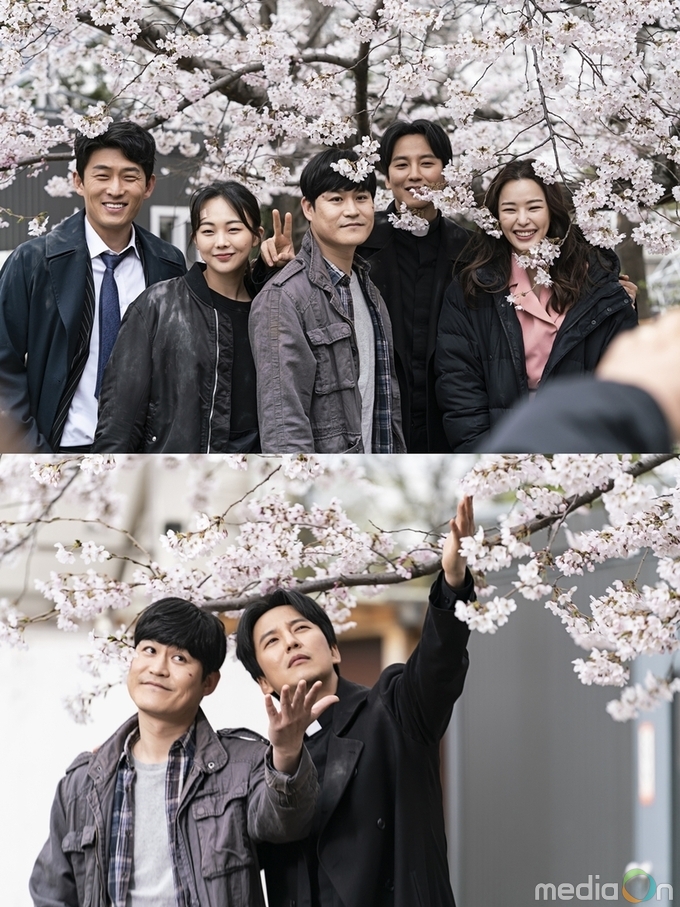 이날 배우들은 지난 35회 속 비밀금고 탈출 장면을 촬영하던 중 만개한 벚꽃을 발견, 잠시 인증샷 타임을 가졌다. 환하게 핀 예쁜 벚꽃을 보며 에너지를 충전, 더욱 활기 넘치게 촬영을 이어나갈 수 있었다고.