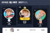 2019년 2월 셋째 주 베스트아이돌이 선정되었다. 2월 셋째 주 베스트아이돌은 강다니엘이 54주 연속 차지하게 되었는데 강다니엘은 워너원 활동이 끝난 지금까지도 엄청난 화력과 인기를 증명하며 최다 선정을 이어가고 있다. 그 뒤를 이어 방탄소년단이 2위에서 5위까지 차트를 휩쓸며 방탄소년단의 위력을 보여줬다. 부동의 2위 3위는 지민과 뷔가, 4위에는 정국, 5위에는 진이 안착했으며 현재 랭킹은 전주 대비 변화 없이 각자의 자리를 굳건히 지키고 있는 중이다. 6위는 하성운이 차지했으며 몇 주간 7위 자리를 놓고 벌인 치열한 다툼 끝에 드디어 박우진이 7위 자리로 한 계단 오르게 되었다. 뜨거웠던 7위 자리는 박우진이 차지하였으며 8위에는 배진영이 안착했다. 9위에는 제이홉이 올라왔는데 지난주 투표보다 4계단이나 오르며 오랜만에 TOP 10으로 등장하여 다음 주 행보가 기대된다. 마지막 영광의 10위는 김재환이 안착하며 2월 셋째 주 베스트아이돌 남자 아이돌 부문 차트가 마감되었다. 베스트아이돌 여자아이돌 부문에는 19주 연속 미야와키사쿠라가 차지하면서 부동의 1위를 지키고 있는데 2월 마지막 주 투표에서도 1위를 차지해 20주 연속이라는 기