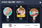 지난 2018년 12월 30일에 마감된 12월 4주차 베스트아이돌 투표는 강다니엘이 46주 연속 개인 랭킹 1위를 기록하며 지난 2018년 마지막 베스트아이돌이 되었다. 미야와키 사쿠라가 11주 연속 여성 아이돌 랭킹 1위를 차지, 그룹 방탄소년단이 6주 연속 그룹 순위 1위를 차지했다. 12월 4주차 영광의 TOP 10은 1위 강다니엘, 2위 뷔, 3위 지민, 4위 정국, 5위 진, 6위 박지훈, 7위 하성운, 8위 배진영, 9위 미야와키 사쿠라, 10위 제이홉이다. 지난 2018년도의 마지막 투표였던 만큼 치열한 접전이 벌어졌다. 강다니엘은 46주 연속 굳건히 1위를 차지했으며, 투표 결산일인 12월 30일에 생일을 맞은 뷔는 전 주 5위 대비 3계단이나 오른 2위를 달성했다. 전 주 2위와 3위였던 지민과 정국은 뷔의 선전으로 인해 한 계단 아래인 3위와 4위에 안착했다. 다음으로 진은 전주대비 한 계단 오른 5위에, 박지훈은 두 계단 아래인 6위에 그쳤으며. 7위 하성운의 자리는 너무도 굳건하다. TOP 10안의 유일한 홍일점 미야와키 사쿠라와는 꾸준한 상승세 배진영은 전 주대비 순위가 바뀌어 배진영이 8위로 한 계단 올랐고, 미