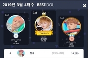 3월 넷째 주 투표에서 강다니엘이 59주 연속 베스트아이돌로 선정되었다. 강다니엘은 현재 소속사와의 분쟁으로 법정 공방을 앞둔 가운데, 강다니엘을 믿고 응원하는 팬들의 열기는 좀처럼 식을 줄 모르고 있다. 무려 4만9398표를 얻어 강력한 기세로 1위를 자리를 독차지하며 59주 연속 베스트아이돌이 되었다. 그 뒤를 이어 방탄소년단의 뷔가, 지민이 장기간 지키고 있던 2위 자리를 약 500표 차이로 앞서면서 쟁취하게 되었다, ‘2018년 세계에서 가장 잘생긴 미남’ 연속 1위를 하고있는 뷔는 현재 해외 각국에서 아시아를 대표하는 가장 매력 있는 스타라며 찬사를 받고 있는데 그 인기에 힘입어 3월 넷째 주, 드디어 베스트아이돌 랭킹 2위 자리에 오르게 되었다. 뷔의 강력한 기세가 강다니엘의 독주를 막을 수 있을지 귀추가 주목되고 있다. 간발의 차이로 3위 자리에 안착한 지민은 방탄 소년단의 솔로곡 중 제일 높은 조회를 유지하며 인기를 실감하고 있는데, 지민의 Serendipity는 무려 8만8000부를 돌파했고, 후배들이 끝없는 커버 릴레이가 놀라움을 자아내고 있다. 지민의 놀라운 인기가 다음 랭킹에서 2위 자리를 재탈환해 올 수 있을지 이